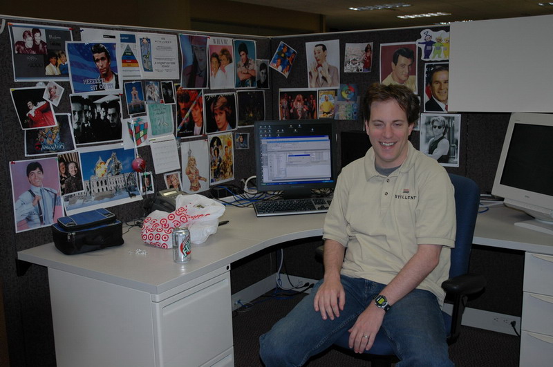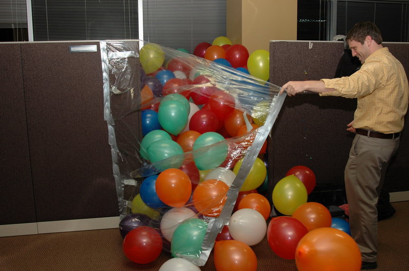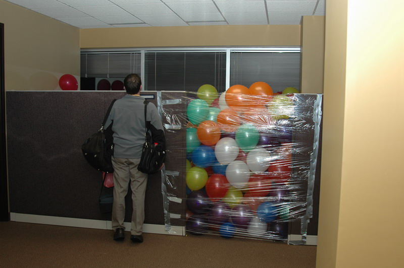 We also filled Joel's cube with balloons. You can see he just got back from vacation and had all his bags with him.